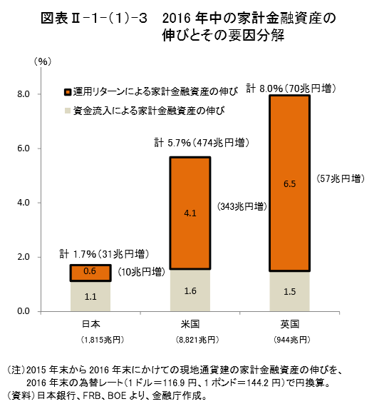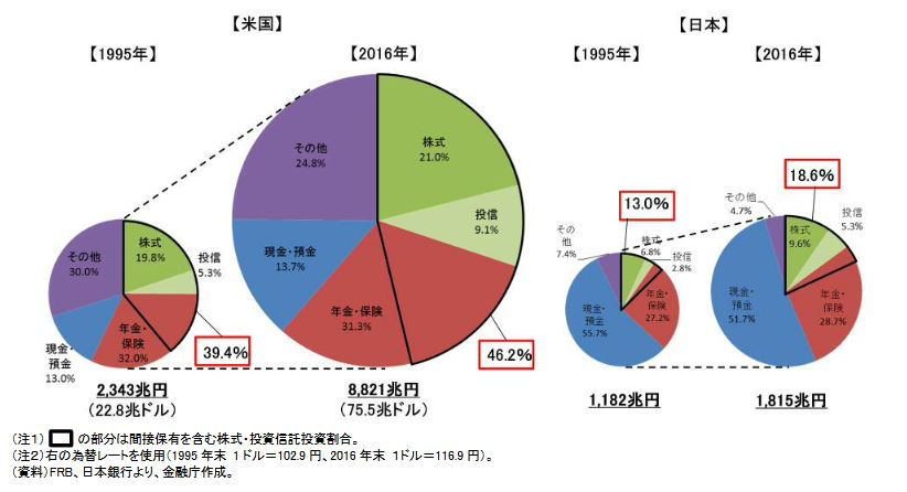 家計金融資産残高の 日米の伸びの差は更に拡大している(米国では+474 兆円、我が国では+31 兆円)。 これらの大半は、日米家計のポートフォリオの違い等による運用リターンの差に起因する と考えられる。出典:平成28事務年度 金融レポート