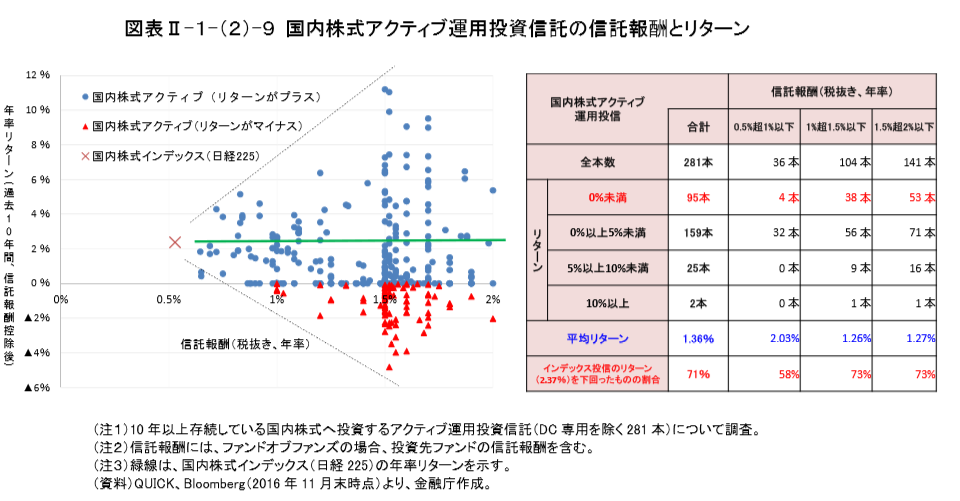 上記データから、 国内株式のアクティブファンドにおいて、71%のファンドがインデックスを下回っている ことがわかります。