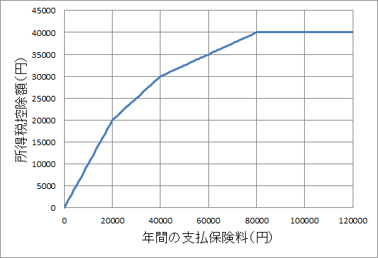 生命保険料は、支払った額の一部を所得控除(所得を税金の計算から除外)できます。控除額は以下のグラフのように、支払額に応じて増えていきます。だんだん控除される割合が減っていきますが、所得税は保険の支払額が8万円以上で、年間最大4万円まで控除されます。