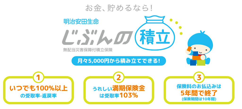 「じぶんの積立」は明治安田生命が提供する貯蓄性の生命保険商品です。一応、死亡保障の商品の形をとっていますが、実質的には貯蓄性しかない保険といっても過言ではないでしょう。