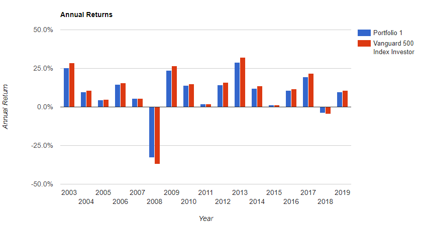 リーマン・ショック時はS&P500は半分以下になっていますね。このポートフォリオも少し低減されていますが、約46%下がっています。