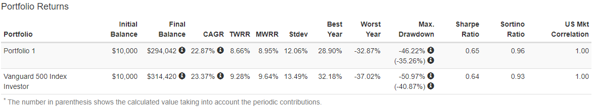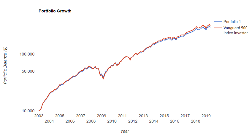 Portfolio Visualizerというツールを使って、 2003年から1万ドルで投資を始め、毎月500ドルを積み立てた結果を求めてみました。