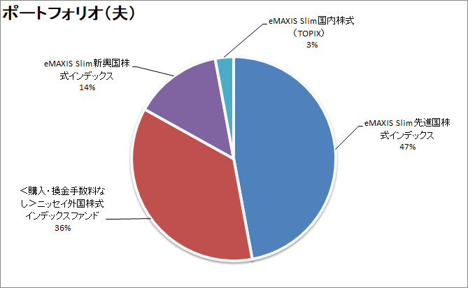 夫側は、基本的に全世界株式に分散する方針です。企業型の確定拠出年金で新興国株式の投資信託が選べないので、その分新興国を多めにしています。