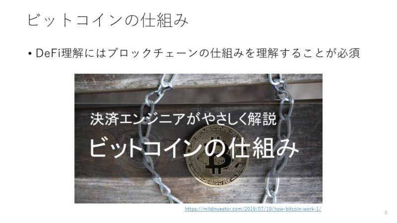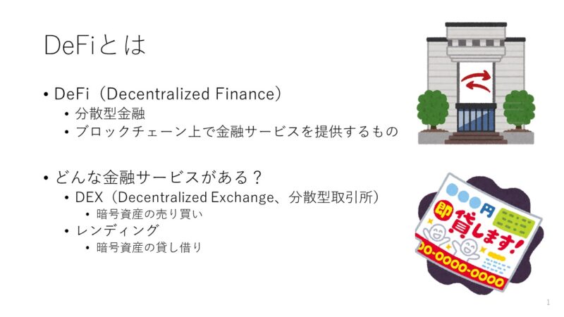 オンラインコミュニティ「 マネーリテラシーの森」では月に1回、参加者がお金に関する勉強会を開催しています。今月は、私がブロックチェーンを応用したサービスであるDeFi(Decentralized Finance、ディーファイ、分散型金融)に関するプレゼンを行いました。本記事ではその資料を説明しながら、DeFiの本質をできるだけわかりやすく解説しています。なお、具体的な資産運用方法などについては触れていません。