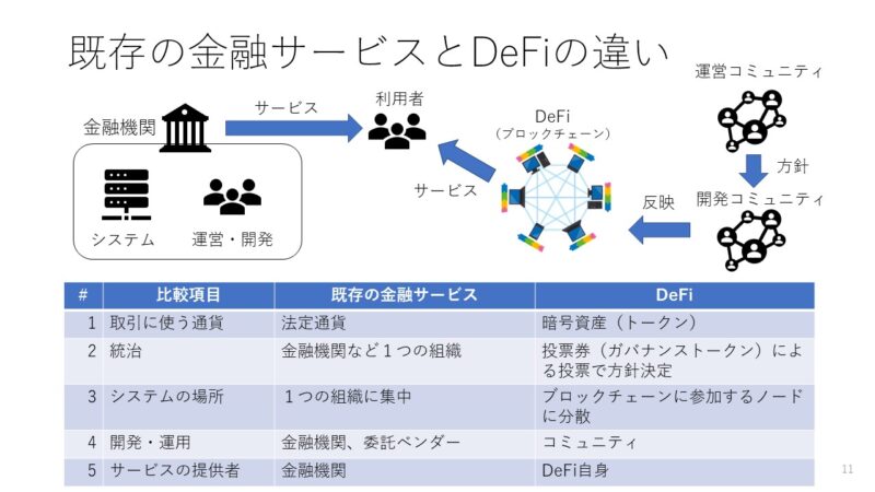 さて、金融サービスは、銀行などもすでに提供していますが、これらとDeFiは何が違うのでしょうか。