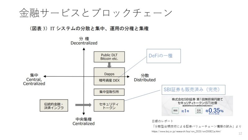 DeFiだけでなく、STO(Security Token Offering)という、証券などをブロックチェーンで管理するものについては、すでにSBI証券など日本の金融機関が社債を発行しています。