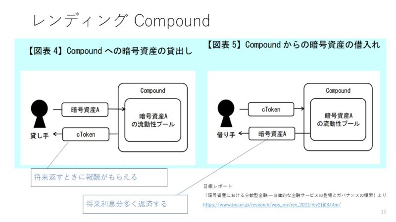 また、暗号資産を借りるときは、借り手はcTokenを担保にして、暗号資産を借りることができます。借りた暗号資産に利息をつけて返すことで、cTokenを回収することができます。