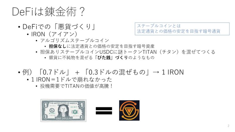 このIRONというものは、一言でいうと「びた銭」づくりをブロックチェーン上で行ったものになります。「びた銭」づくりとは、銀貨などお金の価値の担保になる金属を薄めて、純度の低い偽のお金を勝手に作ることです。