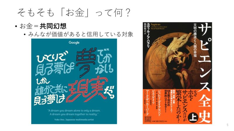 さて、「お金」とは根本的には一体何なのでしょうか。ここの認識がずれていると、暗号資産は理解できません。答えから言ってしまうと、「お金」とはずばり「共同幻想」です。つまり、「みんなが価値があると信用している対象」がお金です。