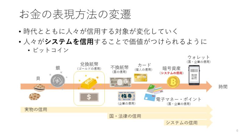 貝や貴金属などの実際に存在する物質、そしてやがて国や企業を信用するようになり、さらにはビットコインの登場により、一部の人々は 「システムそのものを信用する」 ようになりました。この人々が「システムを信用する」ようになったというのがビットコインの革命です。