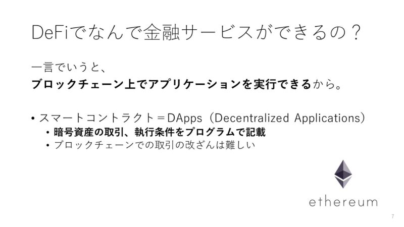 DeFiはなぜ金融サービスができるのでしょうか。それは、ブロックチェーン上でアプリケーションを実行できるからです。つまり、ブロックチェーン上に存在する暗号資産を、利用者が合意した取引内容(契約)に基づき、プログラムによって自動的に動かすことができるからです。このスマートコントラクトという仕組みは、Ethreum(イーサリアム)が最初に実装しました。