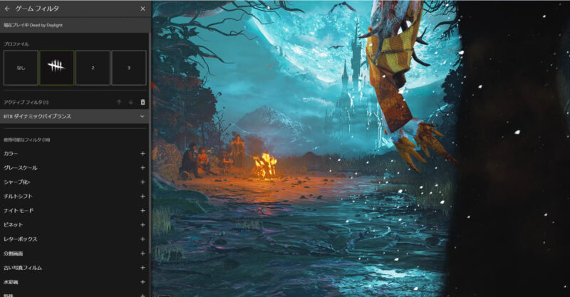 2024年8月のDead By Daylight 8.2.0アップデート以降、画面の色を調整するNVIDIA GeForce Experience ゲームフィルターが使えなくなっています。DBDはゲーム画面が暗いので、明るさの設定が重要で、フィルターなしではゲームをするのが難しい人もいます。