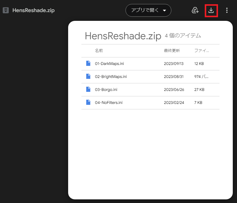 海外のDBDプレーヤーであるHensさんが公開しているReShadeのフィルター設定(プリセット)ファイル(HensRehade.zip)をダウンロードします。以下リンクを開いて、右上の[↓]マークをクリックダウンロードします。