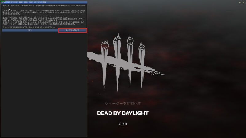 キーボードのHomeボタンを押すとReShadeの設定画面が出てくきます。最初はチュートリアルが出てくるので、[すべて読み飛ばす]をクリックします。