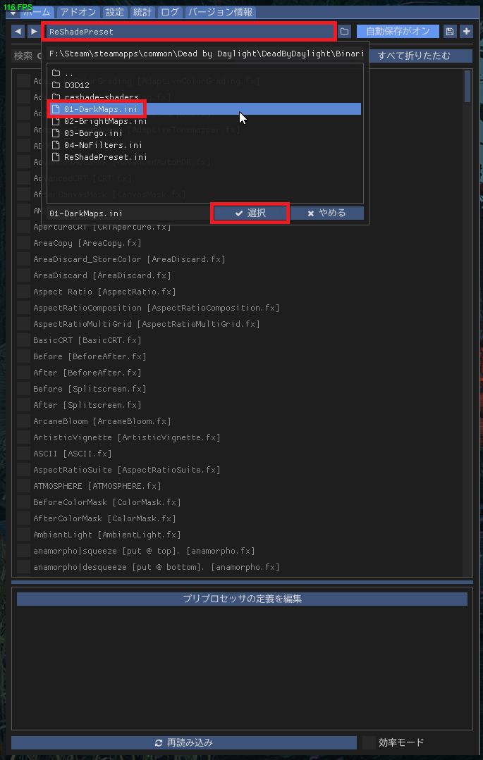 ダウンロードしたフィルタ設定のZIPファイルをDBDインストールフォルダに解凍して、プリセットファイル(iniファイル)を配置します。iniファイルが「DeadByDaylight-Win64-Shipping.exe」と同じフォルダに置かれていることを確認してください。