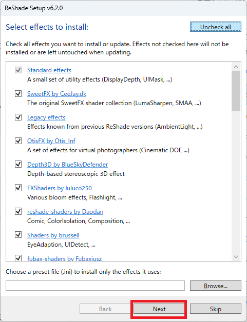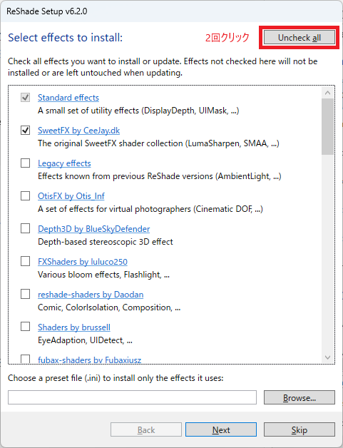 エフェクトは全部インストールするため、右上の[Uncheck all]を2回クリックして、全部チェックされている状態にします。