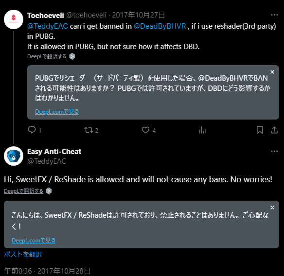 なお、ReShadeはEasy Anti-Cheatで認められているツールなのでBANされる心配はありません。
